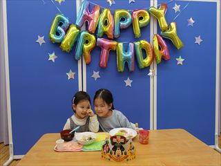 お誕生日のお友だちは、おねえちゃんと一緒にステージの上でご飯を食べました![]()